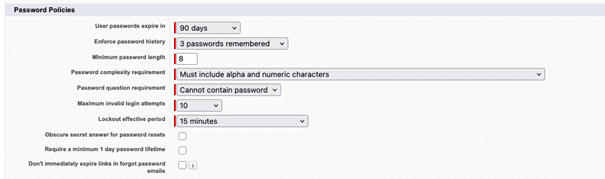 Deze regels kun je op systeemniveau of per gebruikersgroep (profiel) instellen (zie afbeelding hierboven). Respectievelijk via Setup -> Security -> Password Policies of Setup -> Users -> Profiles (sectie Password Policies).