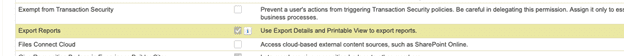 Wanneer een aanvaller toegang heeft tot een account, probeert hij vaak zo snel mogelijk grote hoeveelheden data te exporteren. Een eenvoudige manier om dat te doen is via rapportages. Door een rapport te maken en te exporteren kan veel data in korte tijd worden verzameld. Daarom is het verstandig om rapportagefunctionaliteit of exportmogelijkheden alleen toe te kennen aan gebruikers die dit nodig hebben. Beide zijn in te stellen op het profiel van een gebruiker (Setup -> Users -> Profiles). Als een medewerker voor het dagelijks werk geen rapportages nodig heeft, zet deze functionaliteit dan uit.