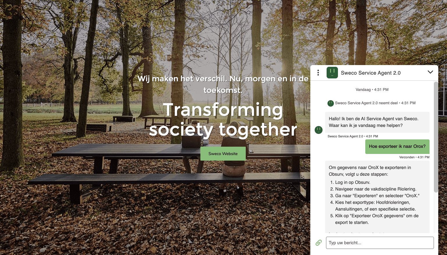 Sweco bracht een concrete en herkenbare uitdaging mee. Hun assetmanagementplatform Obsurv wordt dagelijks gebruikt voor het inventariseren, inspecteren en beheren van de openbare ruimte. De helpdesk krijgt daardoor veel bedieningsvragen: vragen van gebruikers die vooral gaan over hoe bepaalde onderdelen van de software werken. Individueel zijn die vragen eenvoudig, maar samen vormen ze een groot deel van de werkdruk.