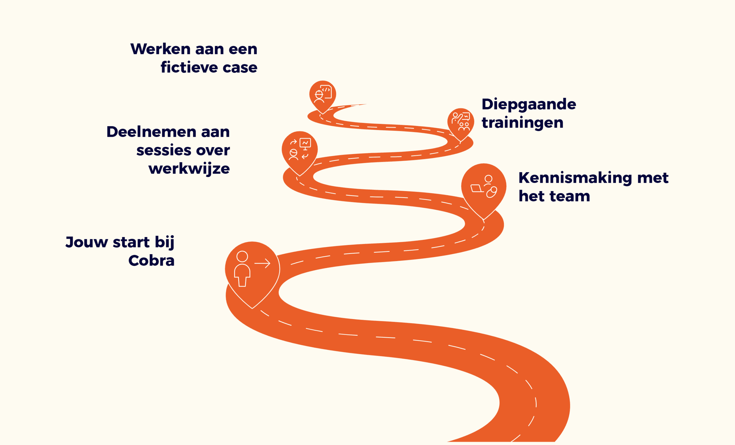 Jouw avontuur bij Cobra begint met een zorgvuldig samengesteld onboardingstraject. In de eerste drie maanden begeleiden we je om je weg te vinden, je kennis op te bouwen en je voor te bereiden op impactvolle projecten. Van kennismakingssessies met je team tot diepgaande trainingen; alles is erop gericht om jouw start soepel en inspirerend te maken. Je werkt aan een fictieve case, neemt deel aan sessies over onze werkwijze en krijgt een buddy die je bijstaat in deze periode. Samen leggen we de basis voor jouw succes!